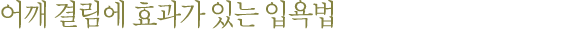 어깨에 42℃ 정도의 더운물과 18℃정도의 미온수를 교대로 각 2분 정도 뒤집어 쓰면 자극으로 순환이 좋아지고 아주 효과적이다. 포인트는 홀수로 물을 뒤집어 쓰는 것에 있다. 이유는 더운물로 시작하여 더운물로 마쳐야 하기 때문입니다. (예를 들면 온→냉→온→냉→온. 또는 , 온→냉→온→냉→온→냉→온) 이렇게 하면 근육이 Relaxation해져 목욕 후에도 어깨가 차가워지지 않기 때문이다.